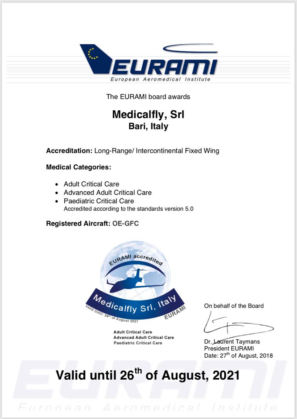 Dopo l’audit svolto prima dell’estate da parte del Dott.MICHAEL BRAIDA, il board di Eurami ha ritenuto la società Medicalfly idonea per il riaccreditamento Eurami – European Aeromedical Instiute – Questa Volta LONG RANGE – Adult and pediatric critical care.
